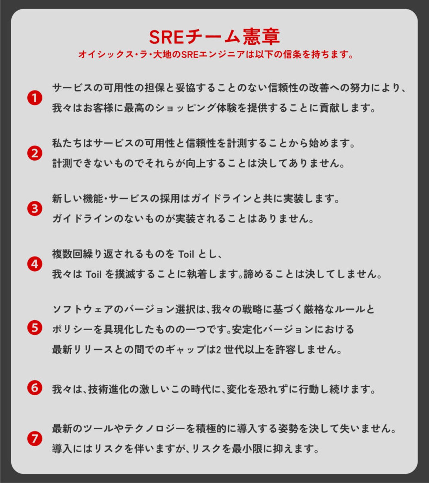 チームとして信条を共有することで、意思決定や方針に一貫性を持たせることができます。特にSREのような役割では、システムの安定稼働を守るために迅速かつ的確な判断が求められます。そこで、何か決断が必要なときや判断に迷う場面で、この信条を基盤にして意思決定ができるようにするために策定しました。