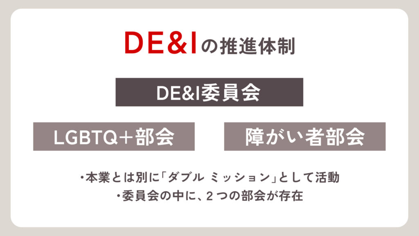 しかし、当社で働くすべての人の「人格・人権・個性」を尊重し、すべての人が働きがいを感じられる組織を実現するためには、多様性へのさらなる理解が必要です。そうした背景を受け、全社一体となってDE&Iを推進する体制が必要だと考えました。