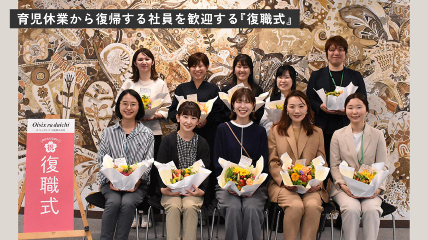 私自身も子育てをしながら働いており、これまでに復職式に2回参加しました。復職前は不安な気持ちも大きかったのですが、社内の皆さんから「おかえりなさい」「待ってたよ!」と温かい言葉をかけてもらったり、社長から「絶対に無理をしないでほしい」と声をかけてもらえたことで、安心して仕事に復帰することができました。