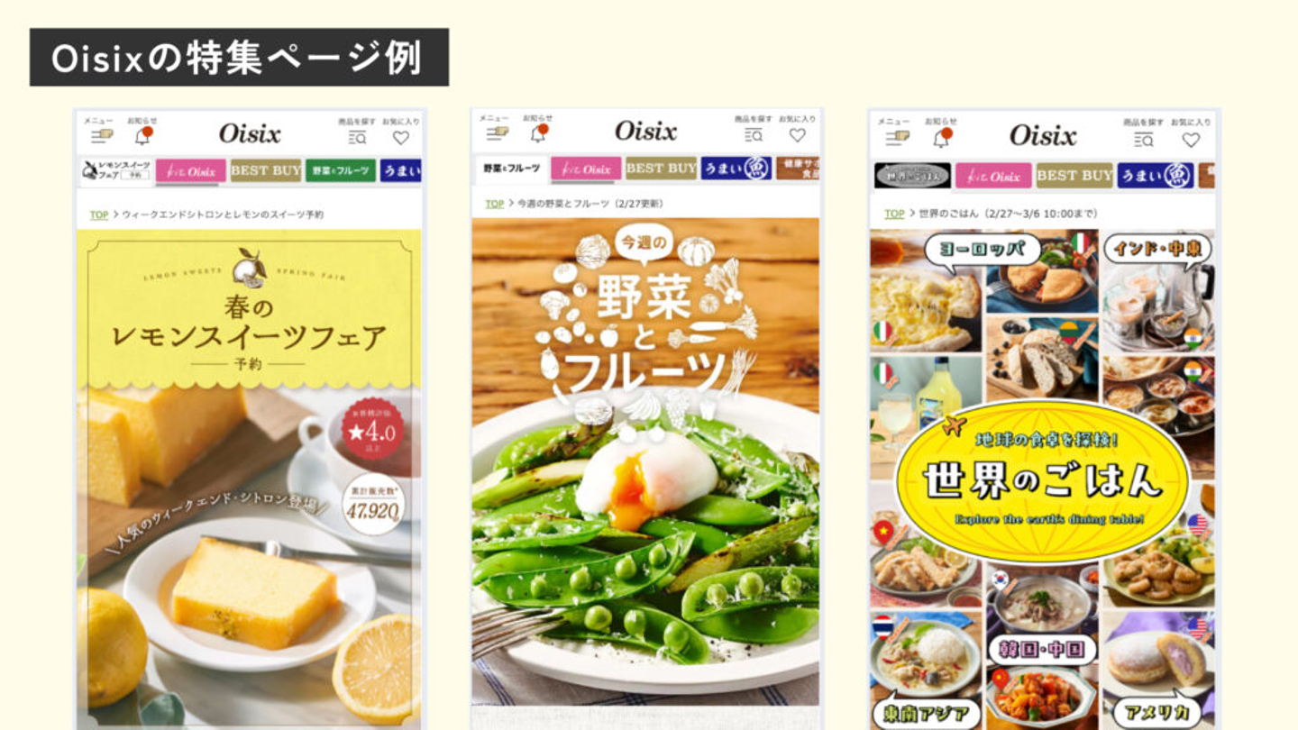 選りすぐりの食材やミールキットなど、毎週1500商品以上を販売する宅配サービス食品宅配サービス『Oisix』。毎週テーマが変わる特集売り場づくりや、季節にあわせた特別商品の販売など、お買い物を楽しんでいただけるように様々な企画を行っています。