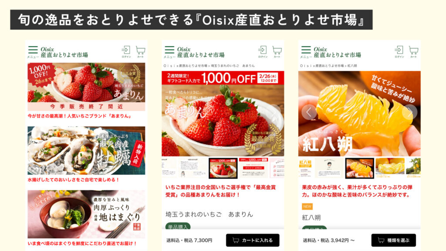 3つ目は、産地直送チームと呼ばれているチームです。Oisixでは、旬の一品を産直直送でおとりよせできる『Oisix産直おとりよせ市場』というECサイトを運営しています。そのサイトで使用されるデザインの制作を担当していきます。