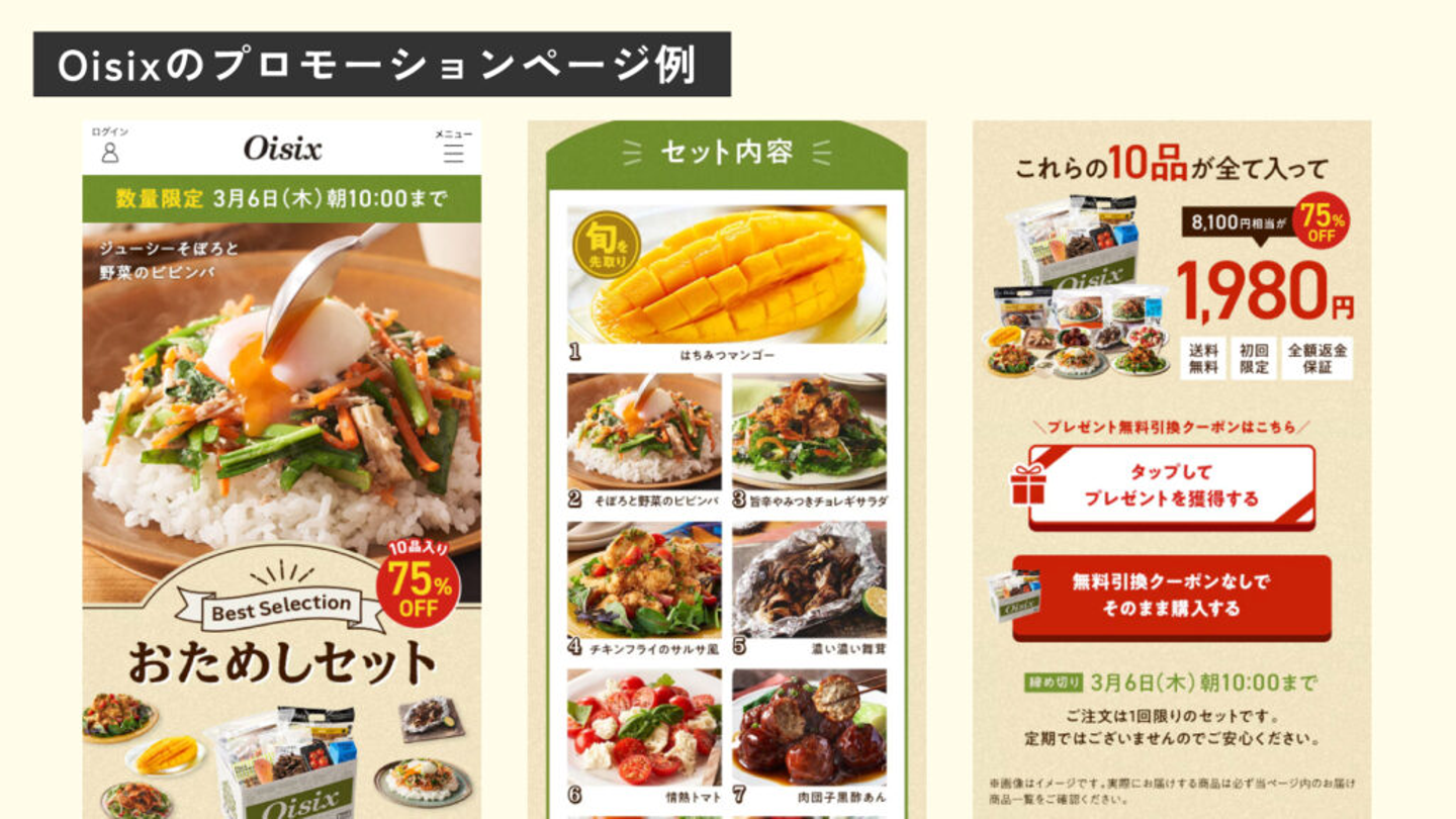 1つ目は、Oisixの新規会員獲得におけるプロモーションを担当するチームです。Web広告として使用するバナー画像やランディングページの制作。ご入会いただくためのコミュニケーション設計などを担当していきます。