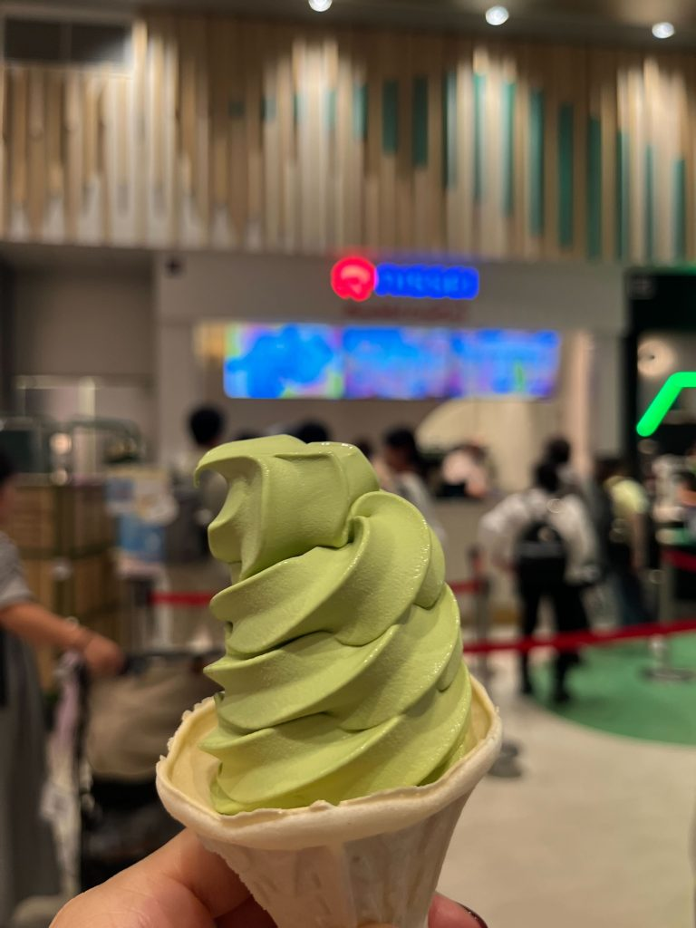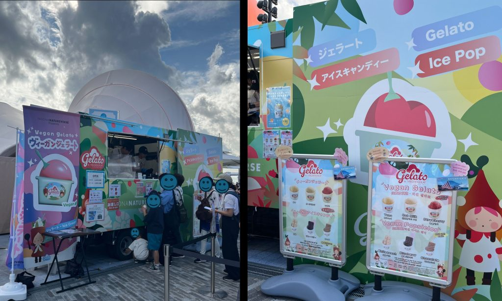 「大阪ヘルスケアパビリオン」の1階にある「ミライの食と文化」エリアの「NISSEI Mouthful Creations」のプラントベースソフトクリームも購入。「いつもの抹茶ソフトクリームとは違うけど、これはこれでおいしい」と、娘も未来の食に興味津々でした。