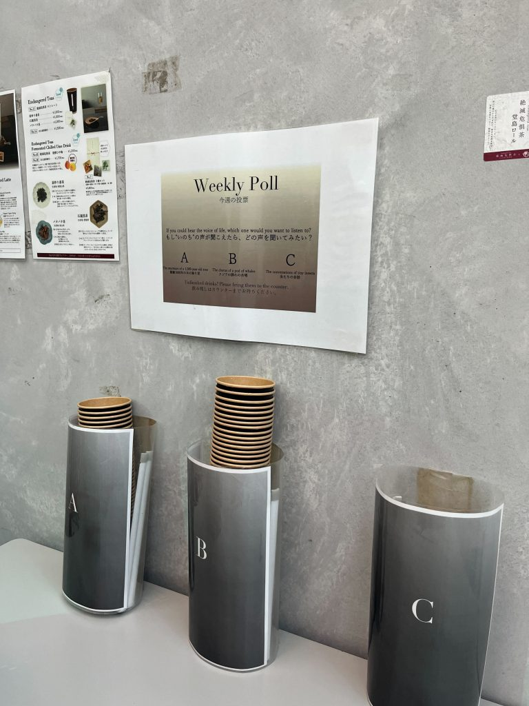 観光地でよく見かけるようになった投票型ゴミ捨て、これならみんなカップをちゃんとそろえてもちろん飲み残しなどせずに重ねたくなりますよね。