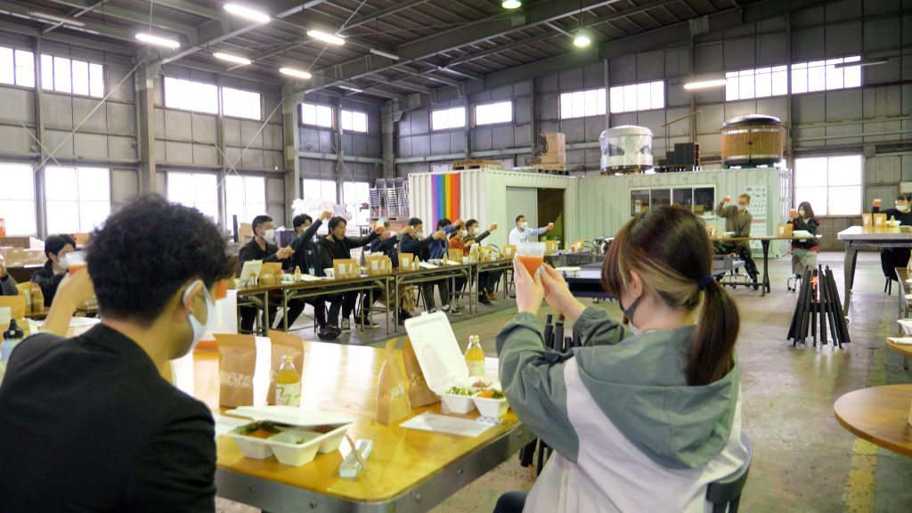 2021年4月5日(月)、大泉工場では、毎年恒例のお花見ランチが行われました。例年は中庭一面に咲く美しい桜を見ながらのランチ会でしたが、今年はあいにくの雨のためWAREHOUSE内での開催。今年の大泉工場の桜が咲き誇る映像がスクリーンに映し出され、趣のある会となりました。