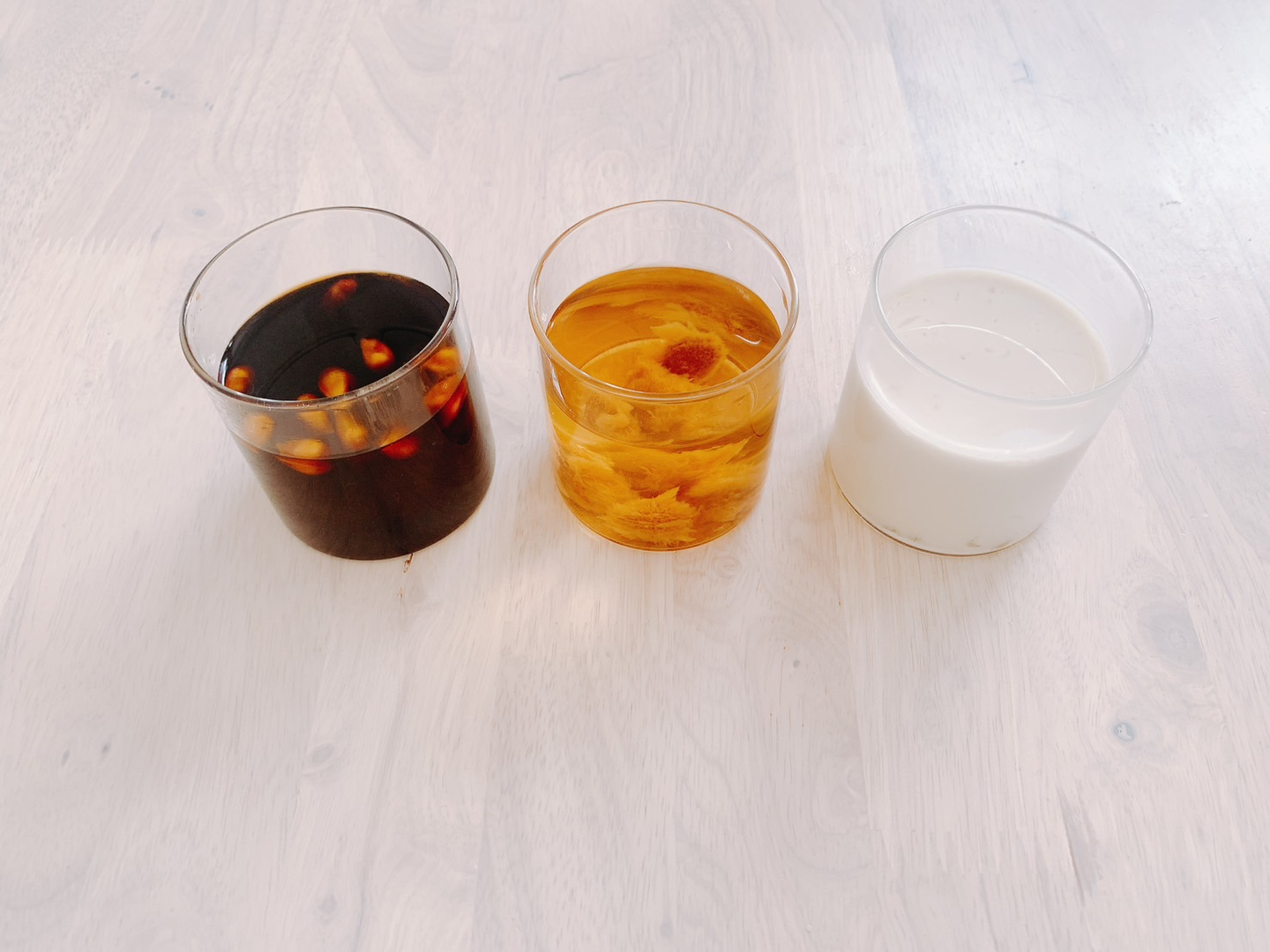 ※画像の説明:左から柚子の種と皮入り醤油・梅酢・豆乳ヨーグルト