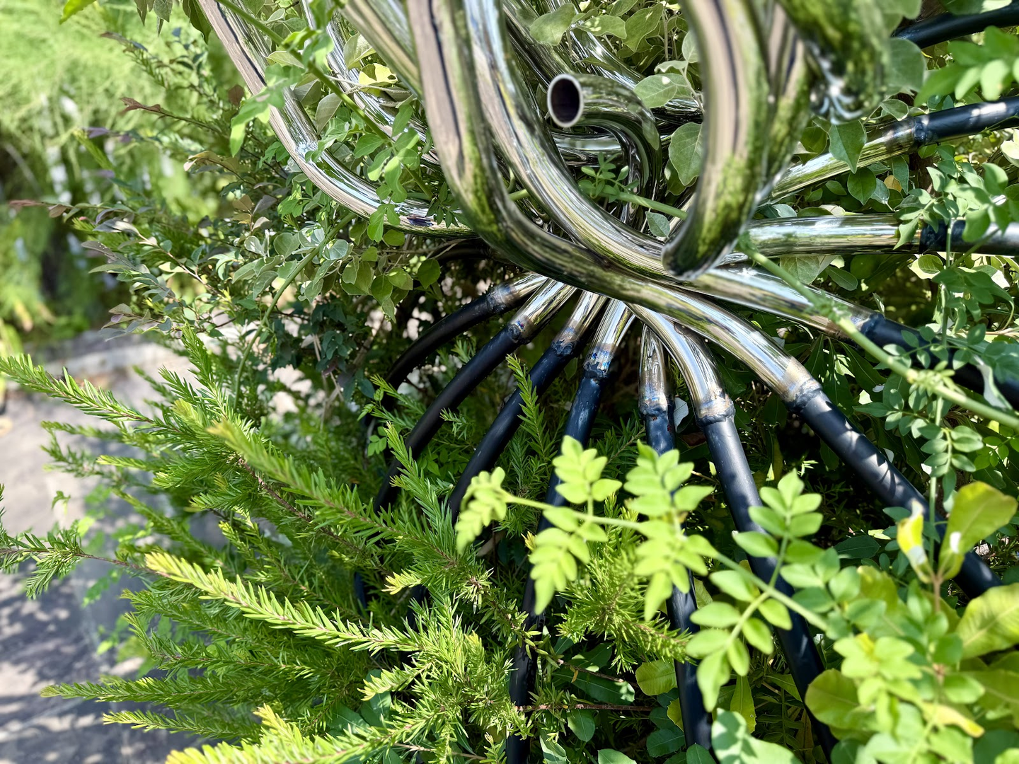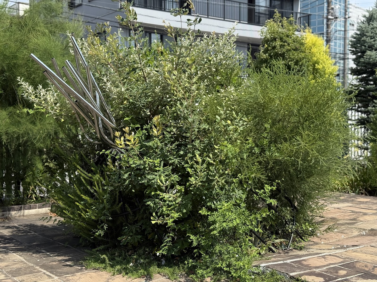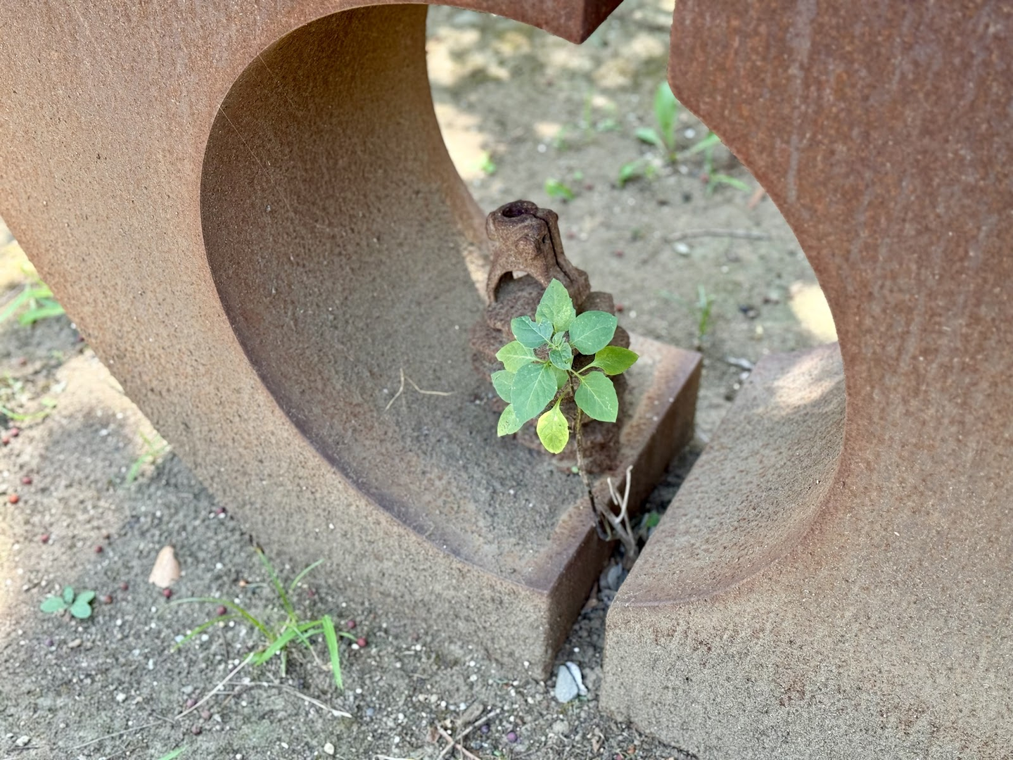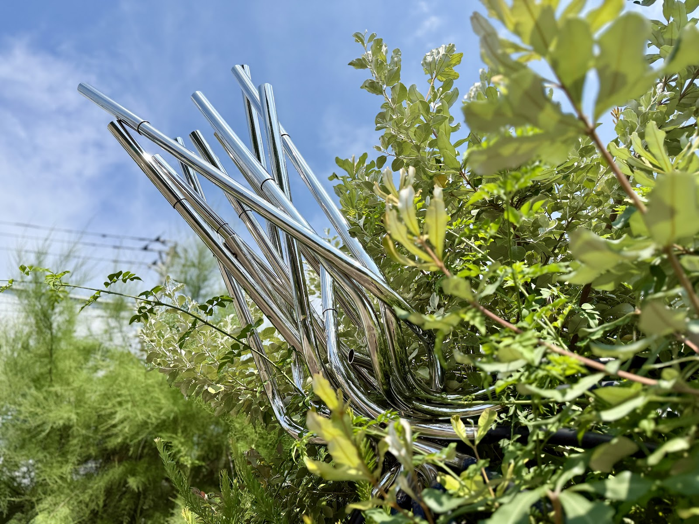 素材として使用している鋳鉄とコールテン鋼は耐候性が強く、鋳鉄は自動車部品と作品設置工事中に地中から出て来た鋳物の「ガラ」を作品の一部として使用したアップサイクルな作品。大泉工場(もともと鋳物工場でした)の生産の名残を作品にも残していただきました。