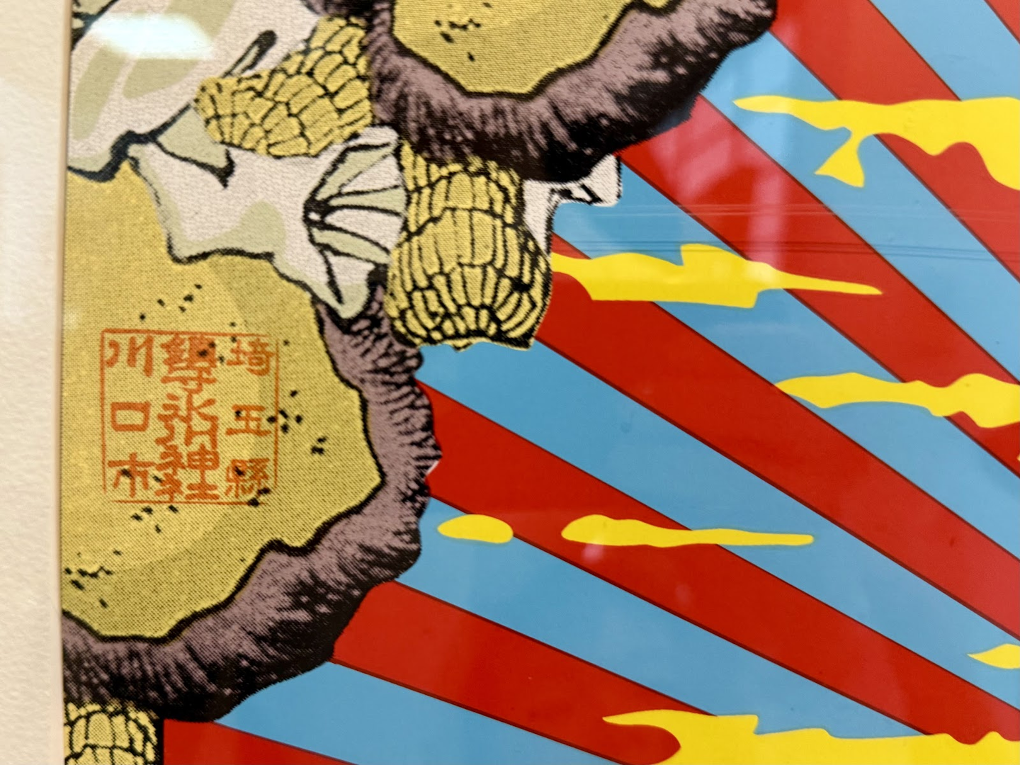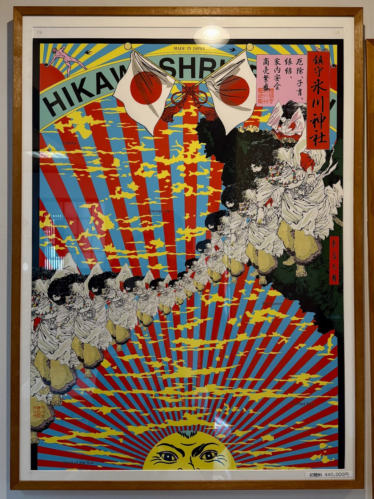 この、神社というイメージからはかけ離れたサイケデリックなアートは、横尾忠則さんの「スサノオ」という作品。先代の宮司さんと横尾さんが対談をきっかけに信仰を深め、この作品が納められたとの事。