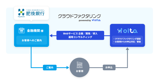 日本初のオンライン完結型ファクタリングサービス「クラウドファクタリング」を提供するOLTA株式会社(代表取締役社長兼CEO:澤岻 優紀、以下、OLTA)は、株式会社肥後銀行(代表取締役頭取:笠原 慶久、以下、肥後銀行)と共同で「ひぎんクラウドファクタリング powered by OLTA」を立ち上げ、2021年5月6日よりサービス提供を開始しました。
