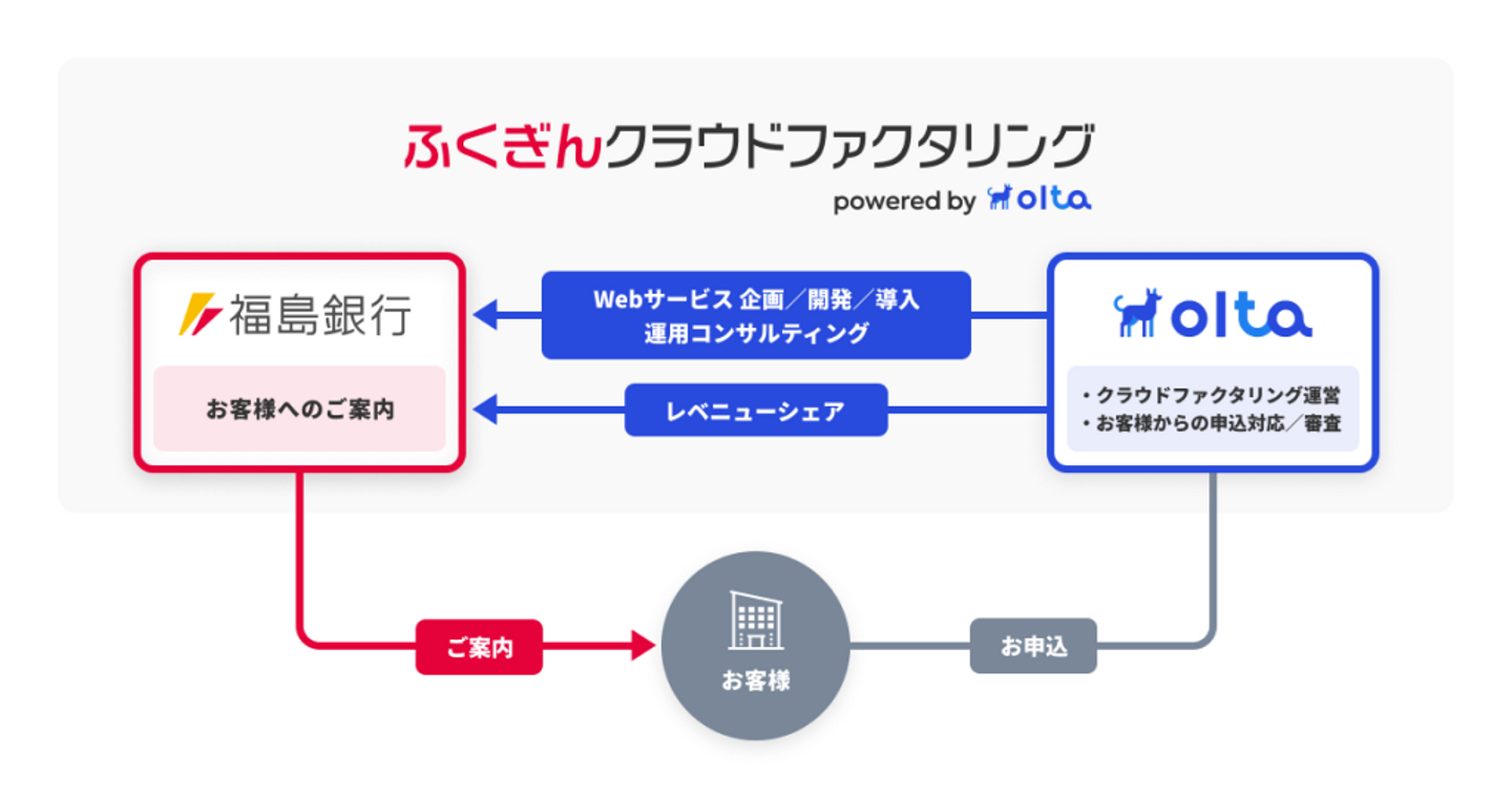 OLTAと福島銀行のクラウドファクタリング事業における提携では、OLTAがWebサービスの企画・開発・導入および運用におけるコンサルティングを福島銀行に提供し、福島銀行は自社ブランドの金融商品のサービスラインナップに加え、法人・個人事業主のお客様にご案内します。