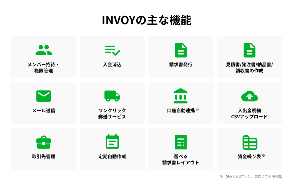 「INVOY」は、OLTAが提供する※1主に中小企業様や個人事業主様の入出金管理をサポートするクラウドサービスです。請求書・見積書・発注書・納品書・領収書の作成・発行・管理のほか、入金消込、郵送代行サービス※2、取引先管理、請求書の定期自動作成など、便利な機能が豊富に備わっており、これらは全て無料でご利用いただけます。