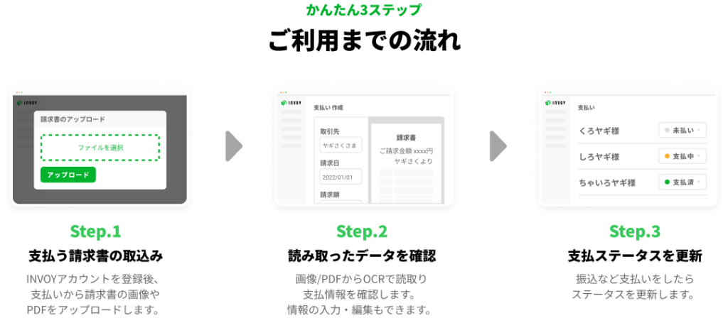 さらに、データ化された請求書は自動で「INVOY」の「支払いサマリー」ページの一覧表に追加されます。この一覧表で支払いステータスの一括管理ができるほか、リマインドメールによって取引先への支払い漏れを防止するなど、支払い業務をスムーズにする便利な機能が豊富に揃っています。