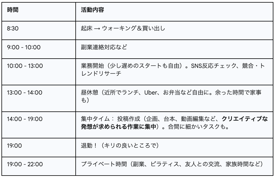 山崎: 私の「わんふり」稼働日はこんな感じです。MTGがない以外は平日業務と基本同じです。目の前の業務に集中できるので、企画立案やコンテンツ作成が捗ります。