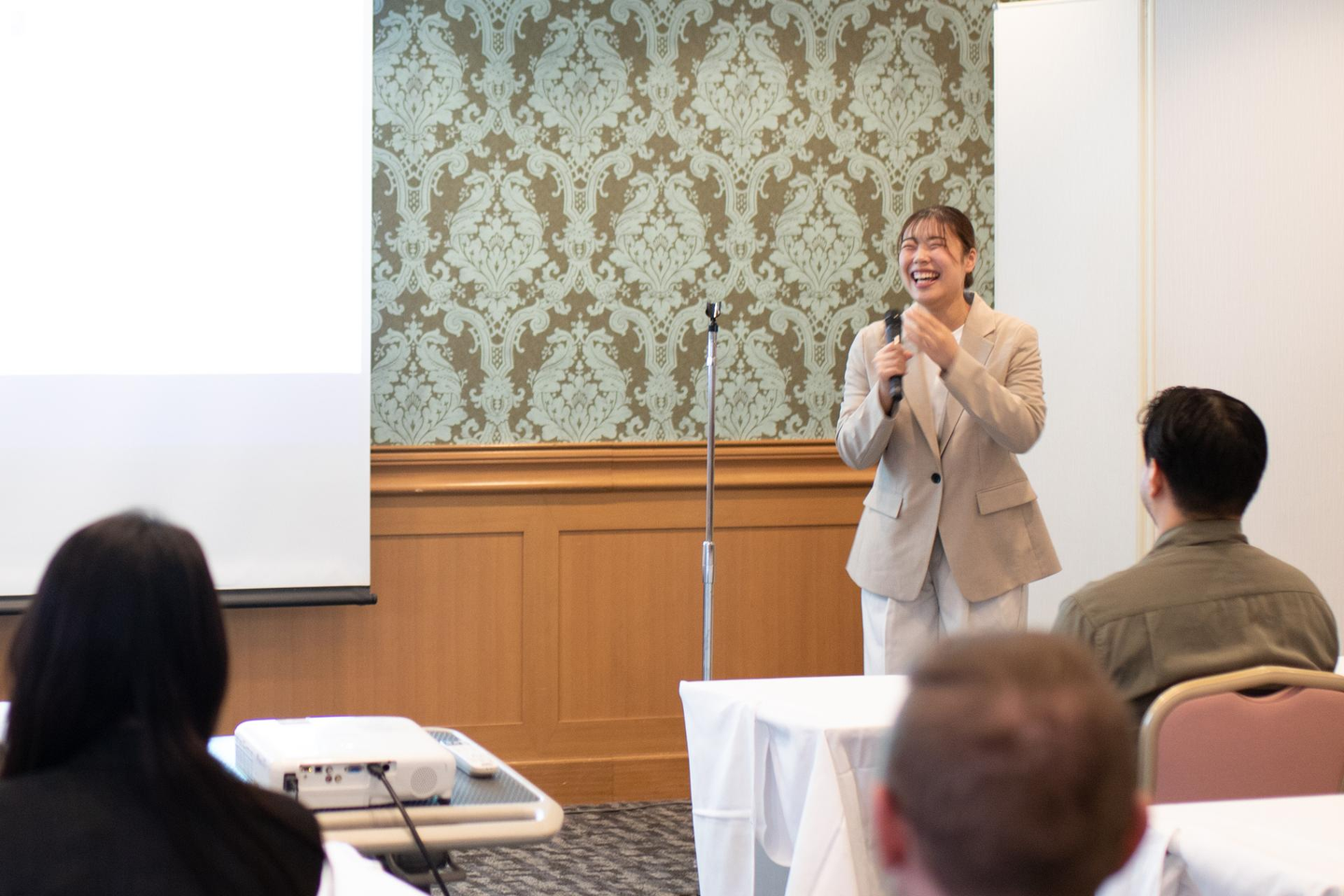 新入社員一人ひとりが前に立ち、英語で自己紹介と決意を語りました。
