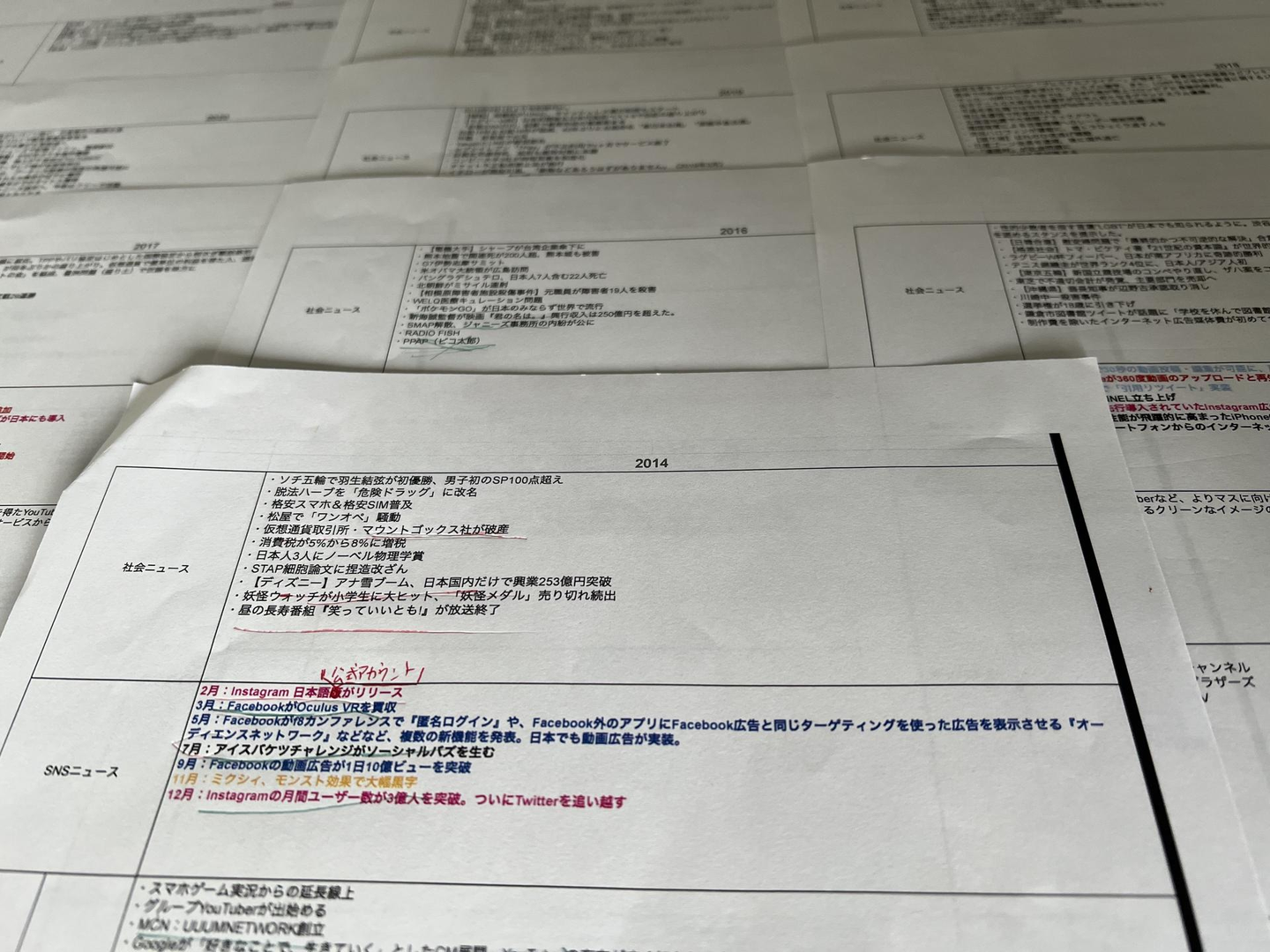 常世田:ものすごい厚みですから。では今回はこの年表を見ながら、SNS コンテンツの変遷について語っていきたいなと思ってます。10年前って、TikTok のティの字もないですね。