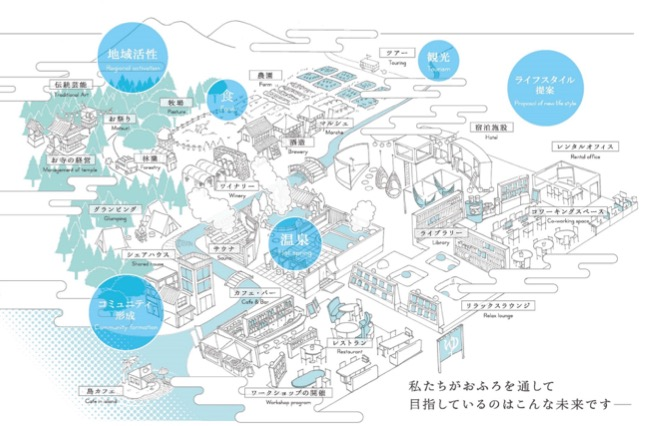 入社2週間目に、社長の山崎さんから「会社案内のパンフレットを作ってほしい」という依頼を受けたんです。そのときに、温泉道場の目指すものをぎゅっと一枚で魅せることができるようなイラストも制作しました。それが「ビジョンマップ」です。