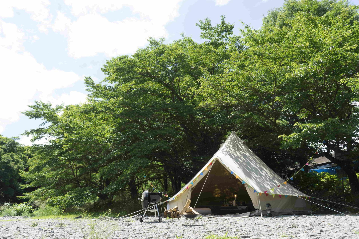目の前に美しい川が流れているのですが、その河原が無許可・無料でBBQや焚き火に利用され、ゴミや焚き火跡の放置が問題になっていました。そこで、遊休地や不採算施設の再生を行う温泉道場が、その河原の管理と活用を行うことが決まりました。そして、2018年の夏に「ときたまひみつきち COMORIVER」としてオープンしたんです。