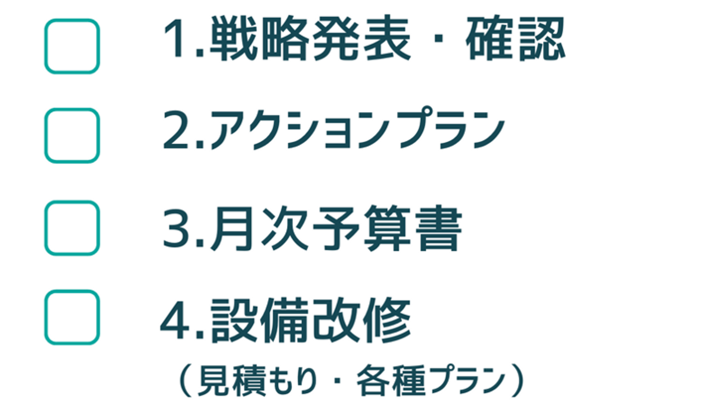 メインテーマは、来季の予算やアクションについて。さらに、各店舗の5年後のビジョン。投資計画、組織体制など議題は多岐にわたり展開されていきます。