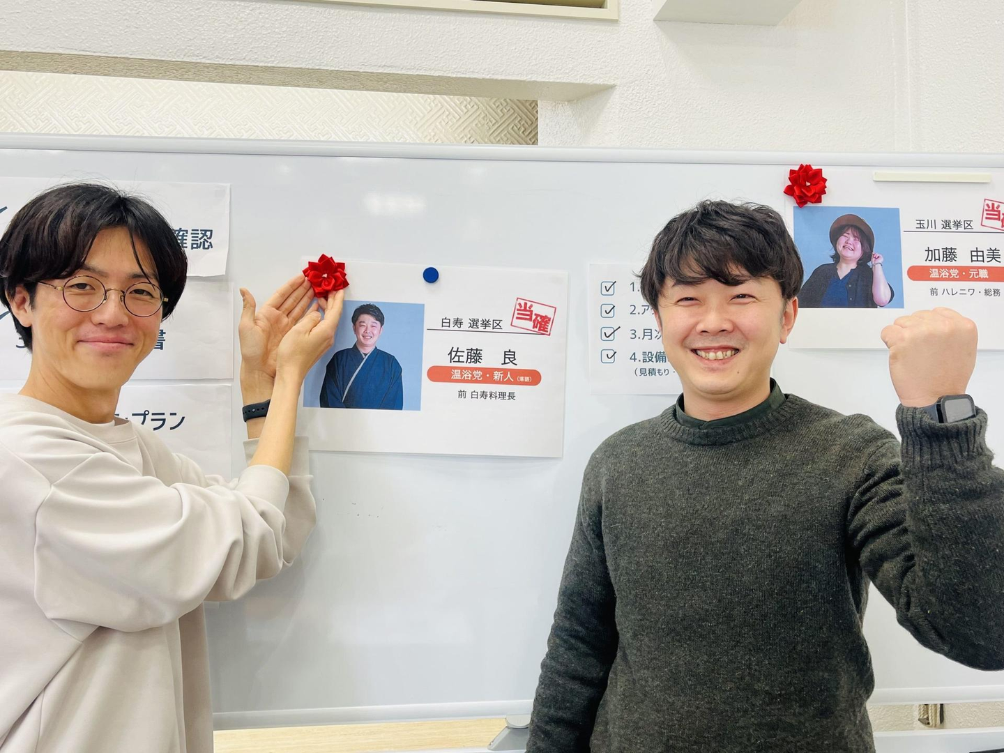 こんな感じで、当確のお花を貼っていきます。やるならとことん!ということで、支配人の皆さんの、イメージで選挙ポスターも作成しました。