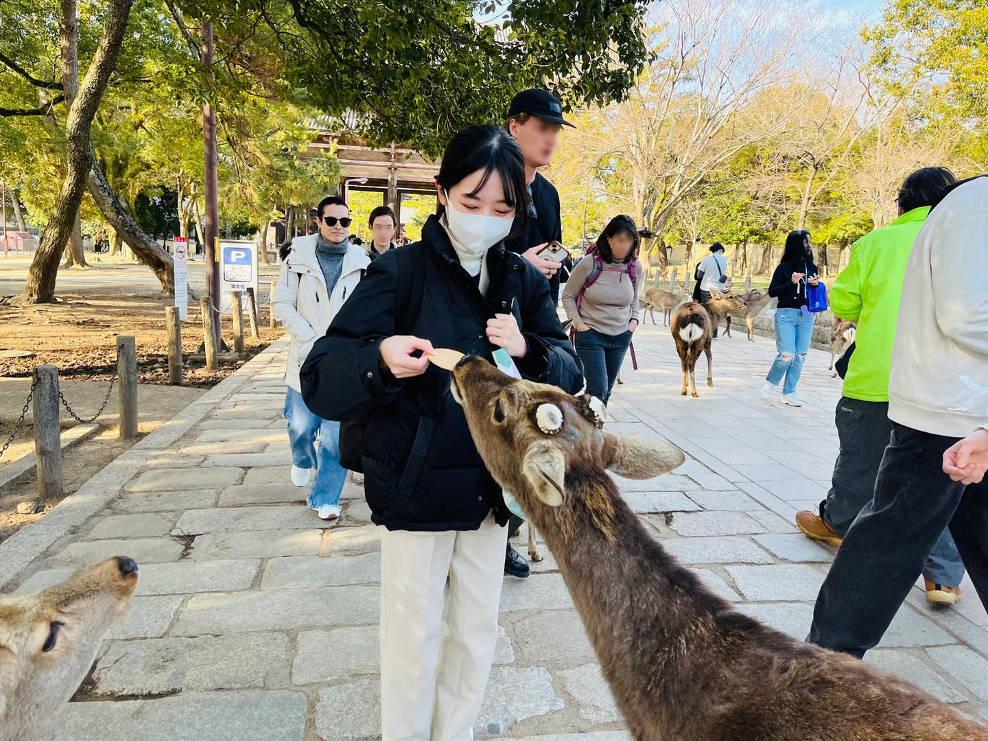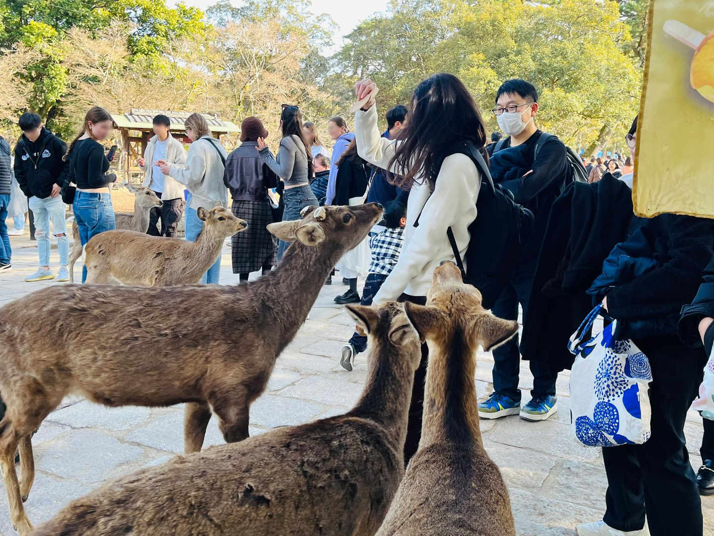 奈良といえば、の鹿さんともご対面。鹿せんべいのあげ方にもメンバーの個性が出ますね。