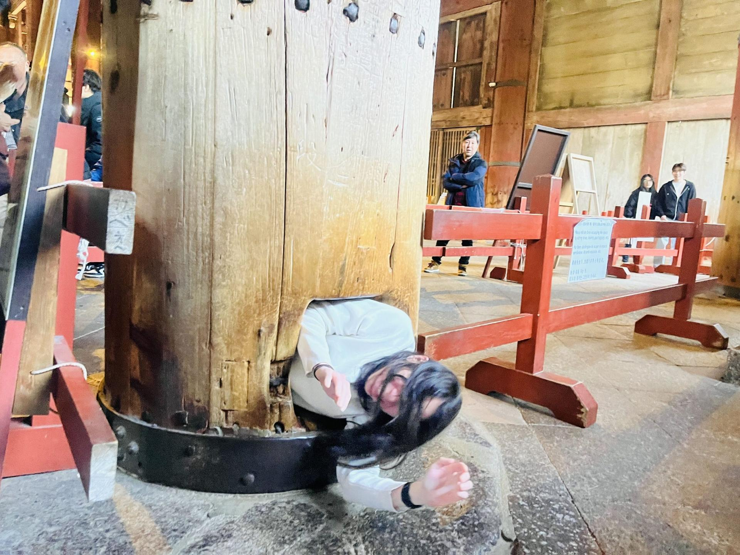 東大寺名物の柱くぐりも温泉道場を代表して専務の白石さんが挑戦! 無事に潜り抜きました!