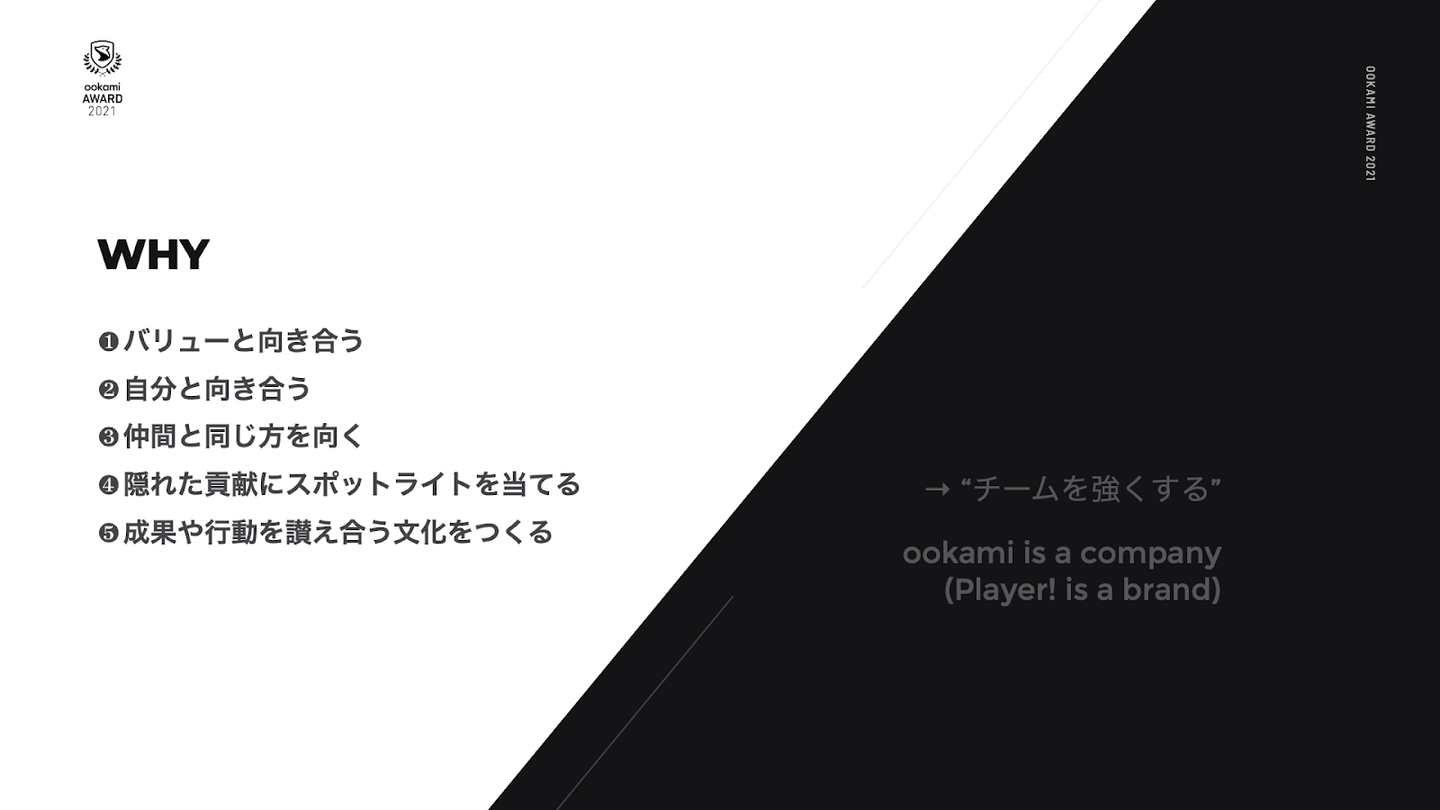 最後のアジェンダとしてookami Awardと呼ばれる表彰制度の説明と、半年間を振り返ってのookami Valueを踏まえたプレゼンがありました。ookamiでは一緒に働く仲間を評価する際は「フィードバックとYellを送ろう」ということを意識して行われます。結果は4月マンスリーミーティングで発表予定です🎖