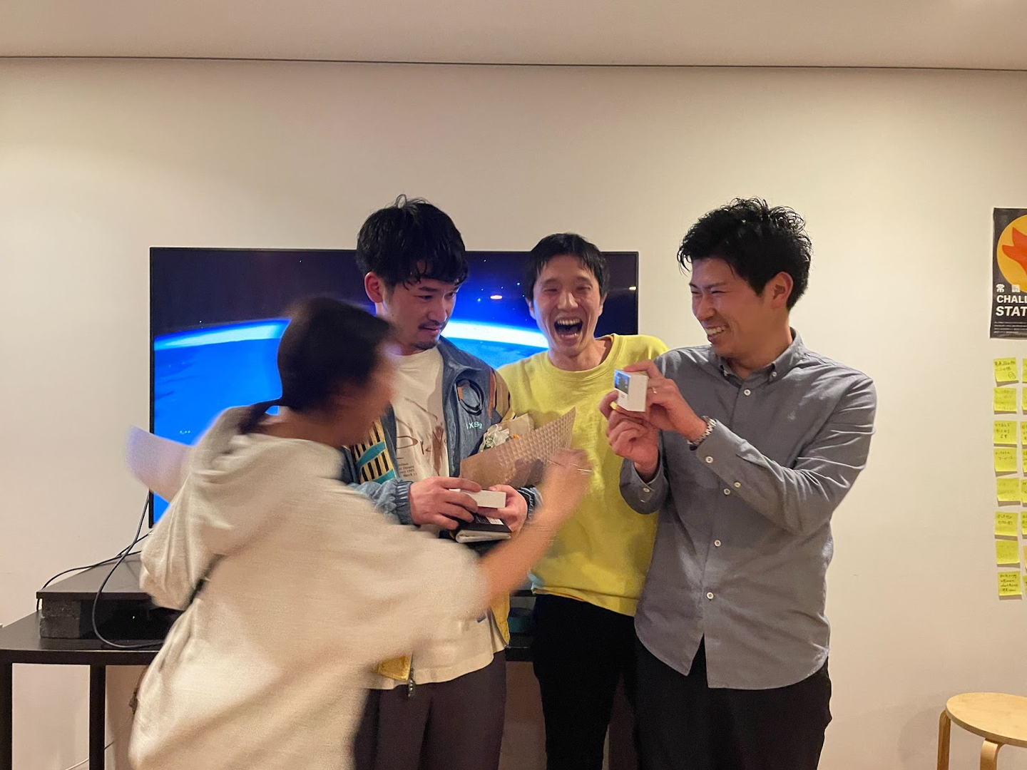 またこれからも一緒に働こうという気持ちを込めて私たちからはookamiの名刺をプレゼントしました!!エンケンさんの肩書きは「アルムナイ(OB)」で、ひさこさんは「エバンジェリスト(伝道師)」で盛り上がっている様子です(笑)