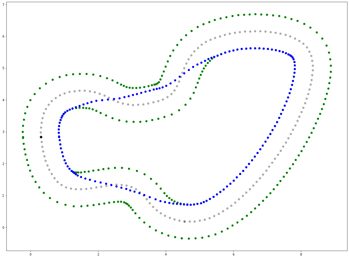 The 2019 track also saw many increments. We obtained the optimum path*6*7 by assigning each waypoint a neuron and the sum of distance between each neuron as the loss function to let them converge (minimize the loss). Below was the optimum path for this track after 20K epochs, which was also the shortest path ever possible(the blue line). Now the agent only needed to learn to drive closer and closer to the optimum while remain fast. There were some other algorithms that calculated optimum racing line differently, but here we used the shortest path as our optimum. Below was our calculated optimum path (blue dots) for the 2019 track: