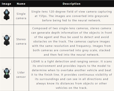 It is a miniature racing car that is 1/18th of a real car in term of scale*1. Furthermore, it comes with different type of cameras and sensors that enable autonomous driving. Following are the available sensors (image courtesy of Amazon Web Service):