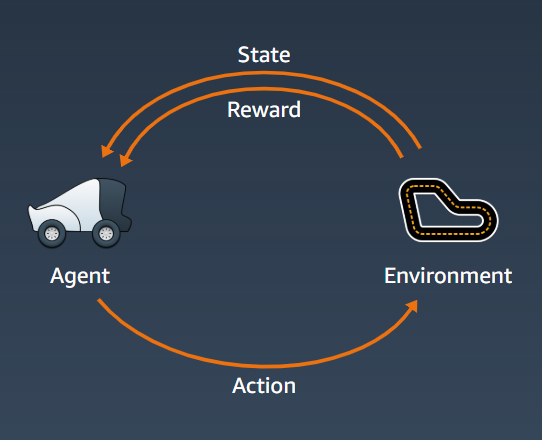 Our agent here is the DeepRacer car. Environment is the actual racing track. Our agent percepts or sees the environment through its sensors, this perception becomes the state of the agent. Then it will perform actions based on its internal set of rules (or model).