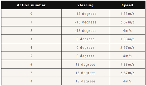 For our current problem, the actions are discrete and separated into 2 groups: steering angle and speed. Steering angle range is 1 - 30 degrees with granularity options 3, 5 or 7. Speed range is 0.1 - 4 ms with granularity options 1, 2, 3. Number of actions is based on granularity only. For example with steering granularity of 3 and speed granularity of 2 will results in total of 3 * 2 = 6 actions.