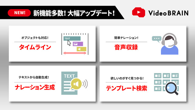 株式会社オープンエイト(本社:東京都渋谷区、代表取締役社長兼CEO:髙松雄康、以下オープンエイト)が提供するビジネス動画編集クラウド2年連続トップシェア(※1)の「Video BRAIN」(ビデオブレイン)」は、動画を構成する要素ごとに出現タイミングを指定できるタイムライン機能の拡充や音声収録など、多くの新機能を追加した大型アップデートを行いました。