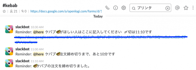 * kebabチャンネル。@hereを用いて、オフィスにいる人だけにメンション。