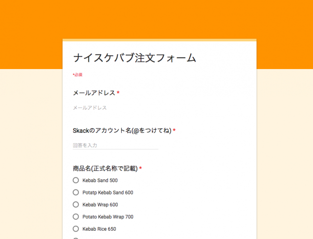 ナイスケバブ専用の注文フォームを作り、ここでケバブを食べたい人は自分で入力するようにしました。上記の青線で隠されているところからこのフォームに飛びます。それをGoogleスプレッドシートでまとめて、全員の注文に漏れがないようにします。