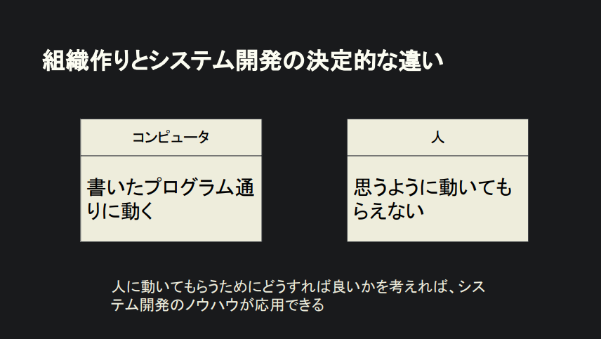 ただし、組織づくりする時とシステム開発する時の決定的な違いというのもあって、