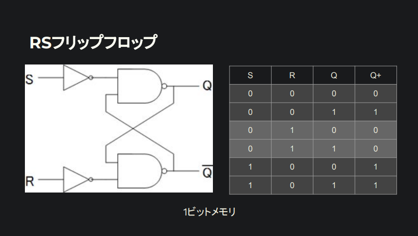 簡単に説明すると、SRというのが入力、Qが出力でQ+が入力に対しての出力の変化です。 上の二つ、SとRに何も入力が無い状態、この時はすべてのQが0でも1でもずっと0と1の状態を維持するんですよね。 真ん中をみると、R=リセットに1が入ると現在の状態が0か1でも、必ず0が出力されます。 最後に、セットに1が入ると現在の状態0でも1でも必ず1が出力されます。