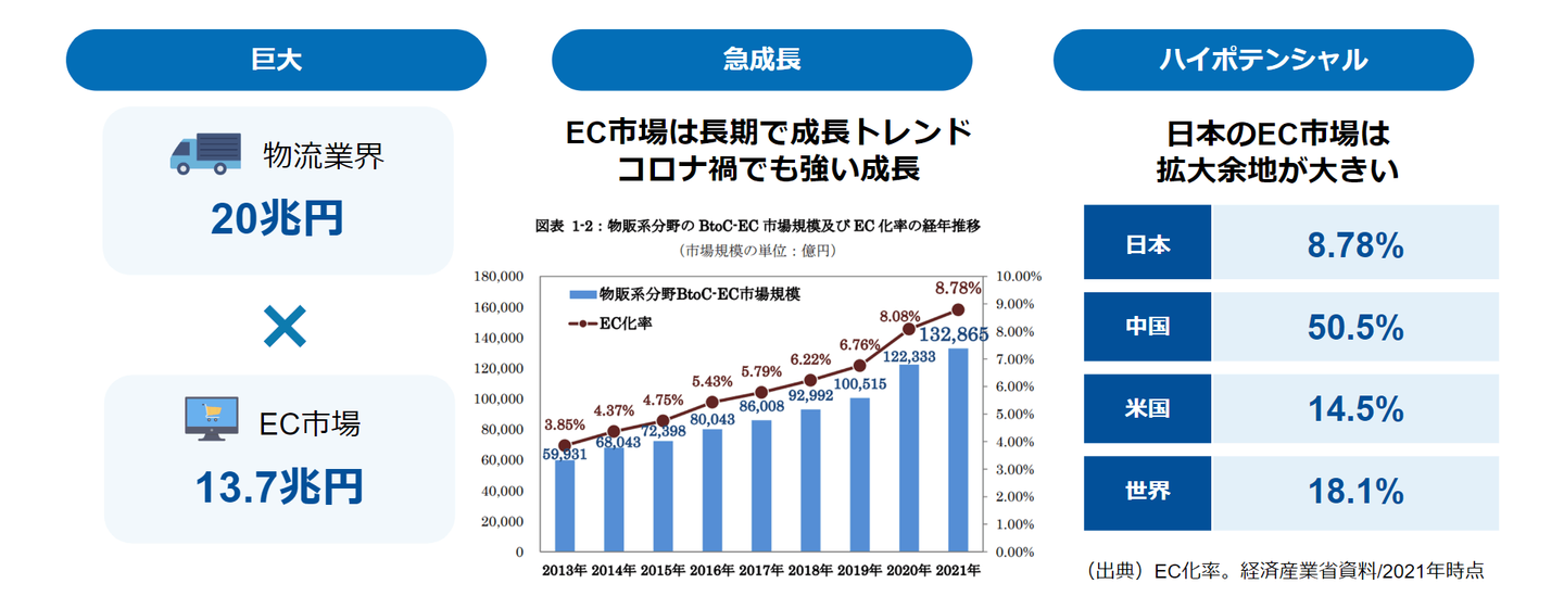 EC市場は年々急速に伸びており、物流と掛け合わせるとその市場は33.7兆円と言われています。また日本マーケットでのEC市場は諸外国に比べて伸び切っておらず、更なる成長が大いに期待できるハイポテンシャルマーケットです。