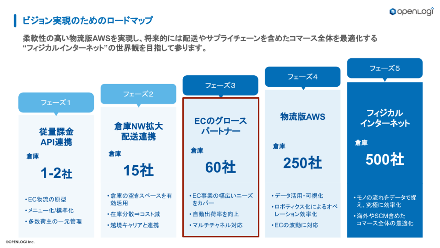 ↑オープンロジが掲げるビジョン達成のためのロードマップ(西宮さんが入社した当時はフェーズ2でした。現在はフェーズ3です。)