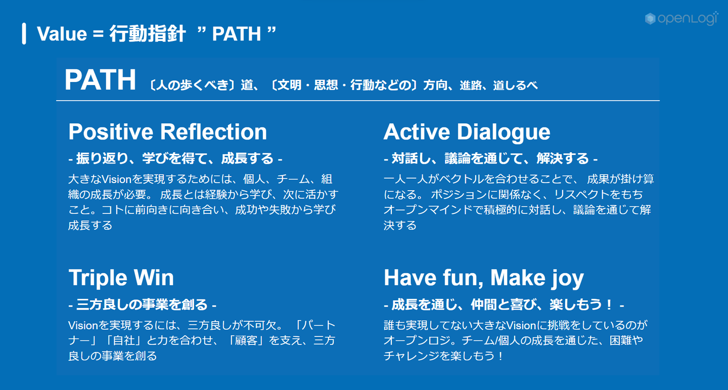 オープンロジには「行動指針」と呼ばれる4つのバリューがあって、それがとても浸透していると感じました。