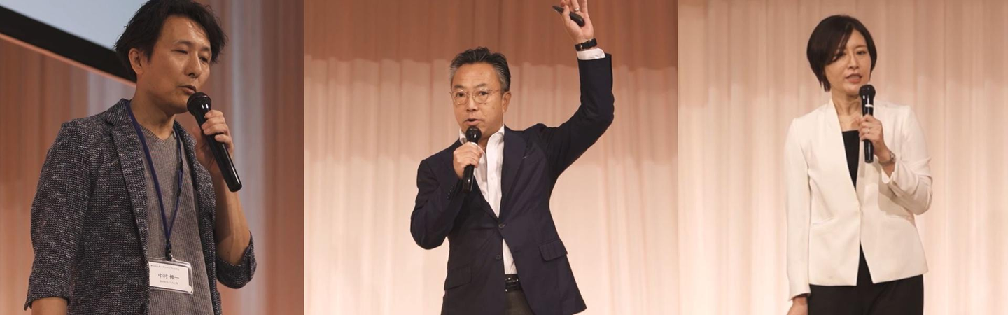 (会社の方針や施策の発表・・・中:簱持社長、左:中村部長、右:鈴木部長)