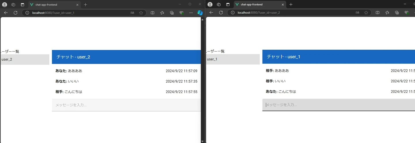 実行方法について丁寧な指示があったため、若干不明な点もありましたが、無事に実行し動作確認を行うことができました。以下のように、user_1とuser_2間でリアルタイムにメッセージのやり取りが可能となっています。