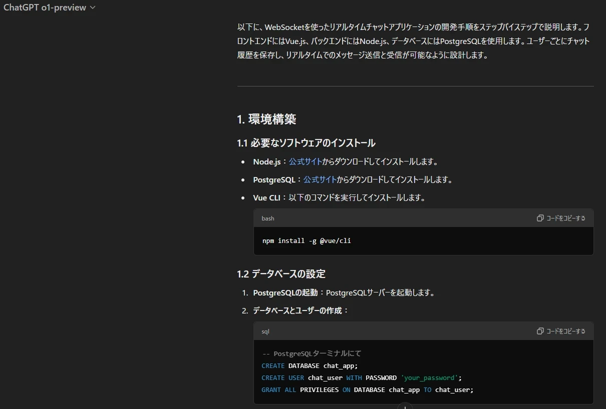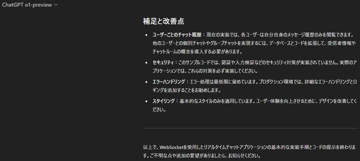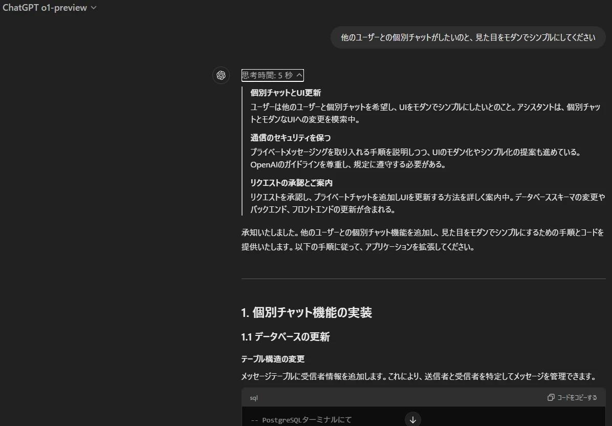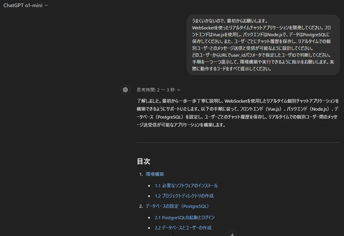 OpenAI o1-miniを使用して、今までうまくいかなかった部分の指示を追加したプロンプトで再度チャットアプリ開発を依頼しました。