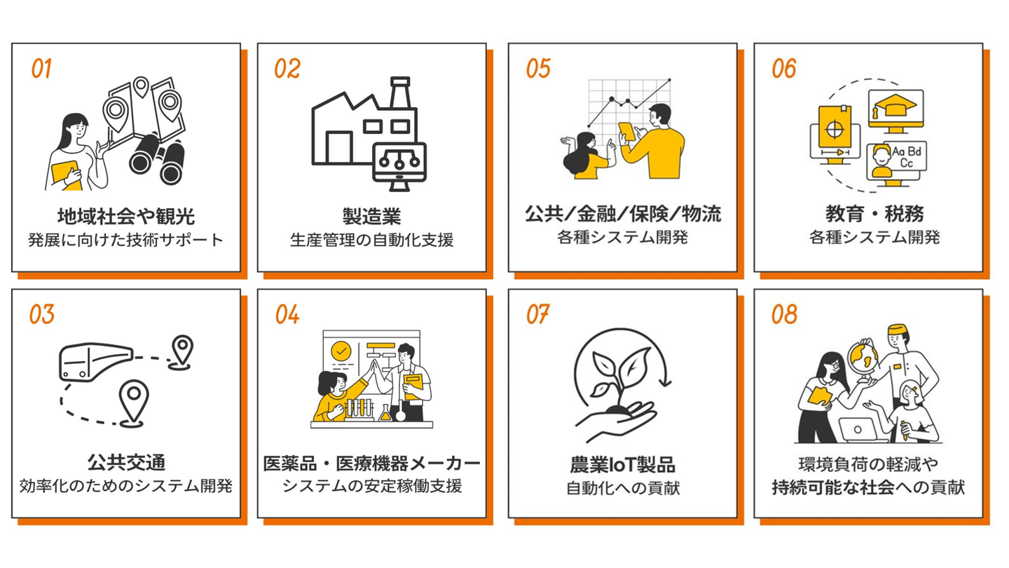 当社エンジニアの皆さんの開発業務は、社会インフラ支援を中心に技術の進化とともに社会に大きな貢献を果たし現代社会に耐えうるインフラを支えています。また、これらによりクライアント企業のビジネス効率化や経済成長にも影響しており、その影響力は増大化しています。