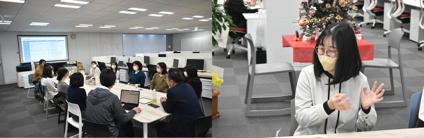 最終審査は本社とオンラインでのハイブリット開催。最終審査ということで緊張感が漂っていたものの、司会のSさん&Mさんによるコントとも捉えられる進行で場が和みます。