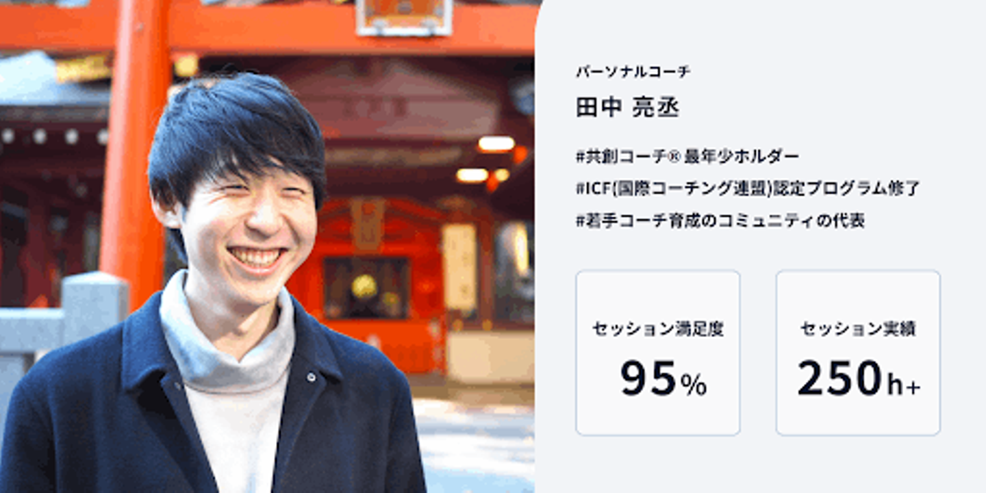 コーチを担当するのは、オプティマインドでの業務経験もあるコーチング歴4年の⽥中亮丞(たなか・りょうすけ)さんです。中学生から40代の社会人まで幅広い年齢層へコーチングを行った経験があり、仕事のキャリアを含めた自分の現在や、在りたい姿を捉え直すセッションを多く行なっています。