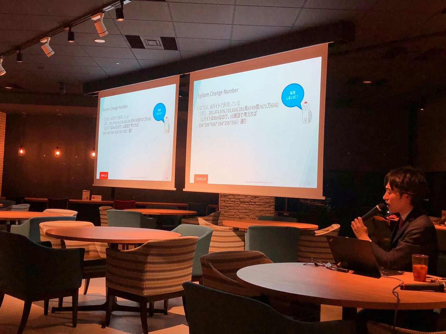 またSCNが枯渇しないかという疑問に対しては、「SCNは6バイトで表現しています。1バイトは8bitなので、10進法で考えれば256×256×256×256×256×256通り。つまり281兆通りなので、毎秒10万トランザクションが24時間続いたとしても、89年間枯渇しない計算です。普通毎秒10万トランザクションなんてないので、枯渇の心配はほぼないと言えます。」と語り、オラクル コンサルタントらしく、データベースへの深い理解が垣間見えました。