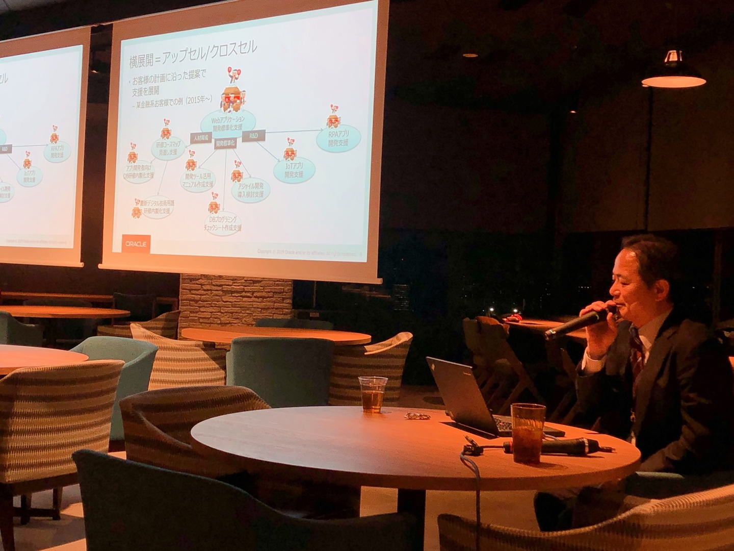 学生時代の21歳の時に、劇団ひとりなどが所属する太田プロで放送作家となります。そして24歳で放送作家の仲間と起業。「まぁまぁ稼ぎました」と笑いつつ、「ですが放送作家は斜陽の仕事だったため、方針転換してITの仕事をしたいと思うようになりました」と語ります。そして28歳で日本オラクルに入社。昨年はロイヤルカスタマーのプロジェクト・マネージャーとなり、責任ある立場を任されます。