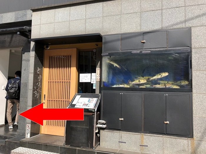 右奥『とらふぐ亭』側に信号を渡り、大きな水槽のふぐたちに向かって左方向へ坂を下っていきます。