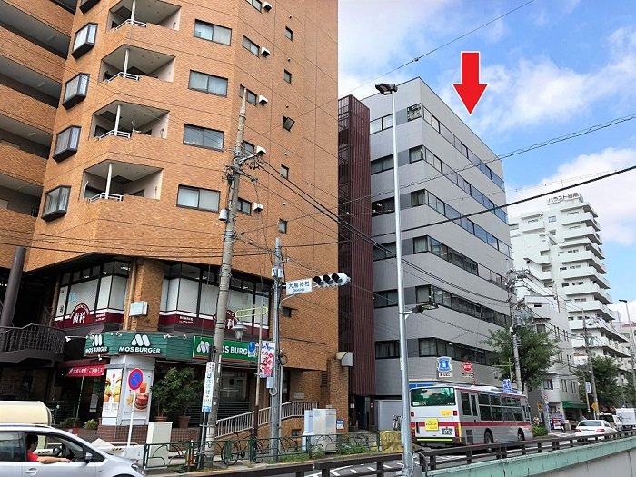 この交差点を渡り右に曲がると…!オロ東京本社が入る『目黒須田ビル』が見えてきます。(1Fのローソンが目印!)
