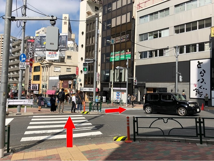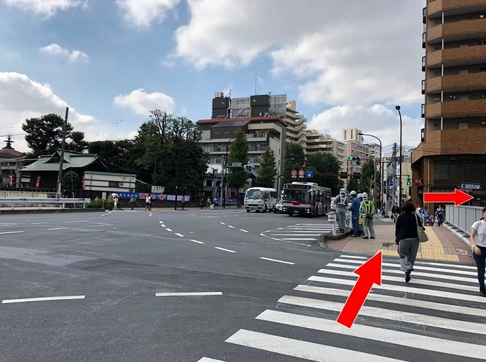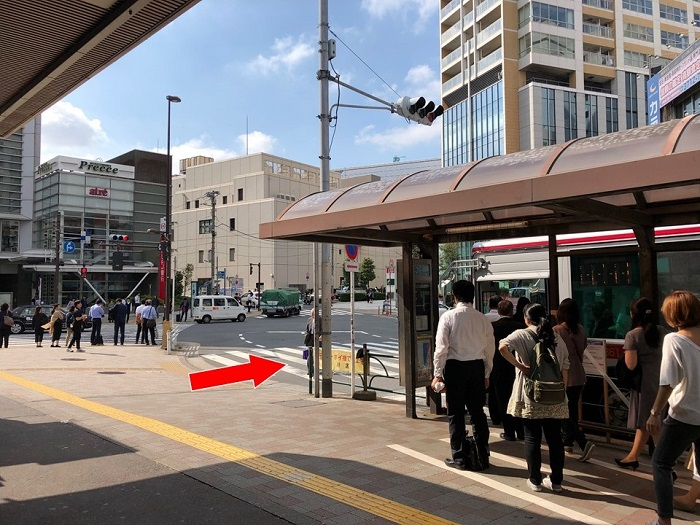 左前に交差点があるので、先頭のバス停を横切る形で横断歩道を渡ります。